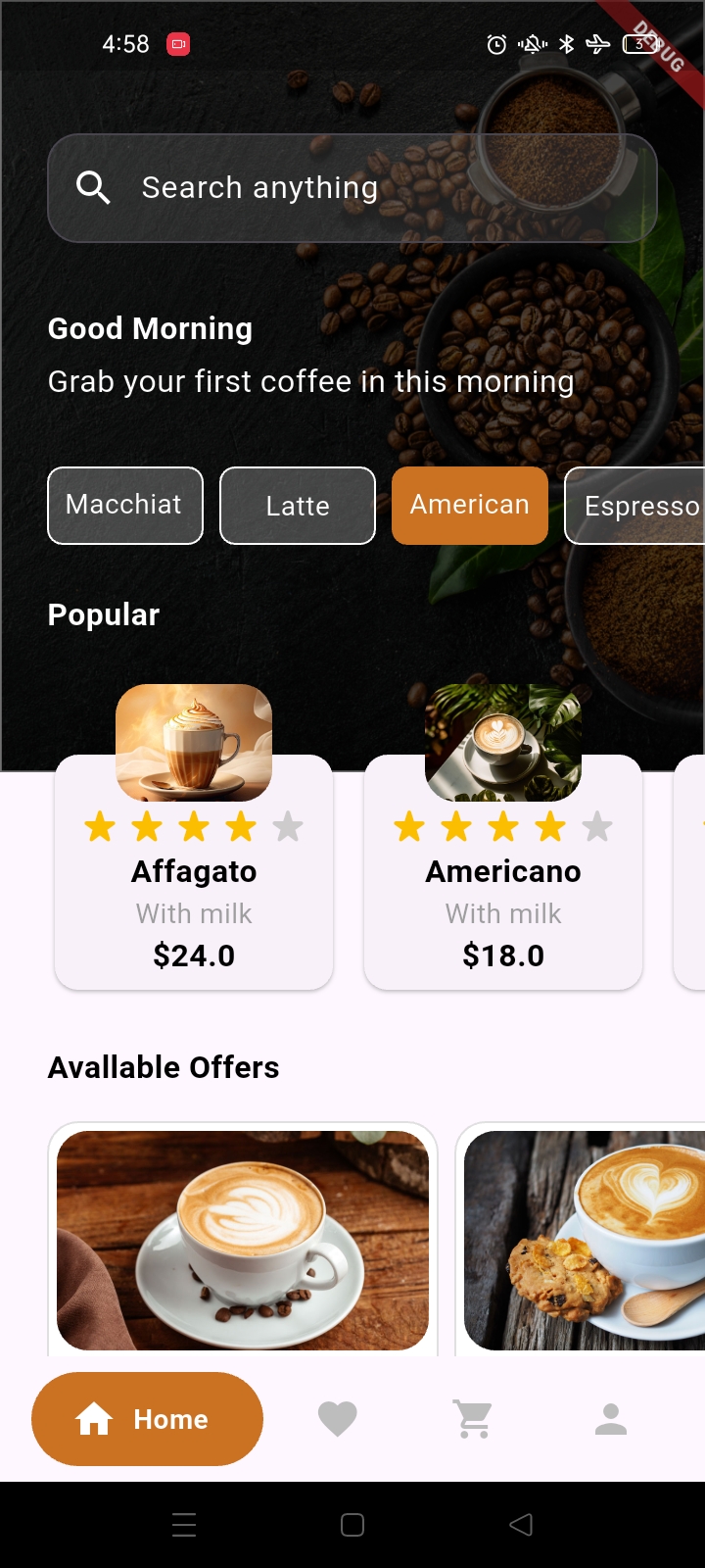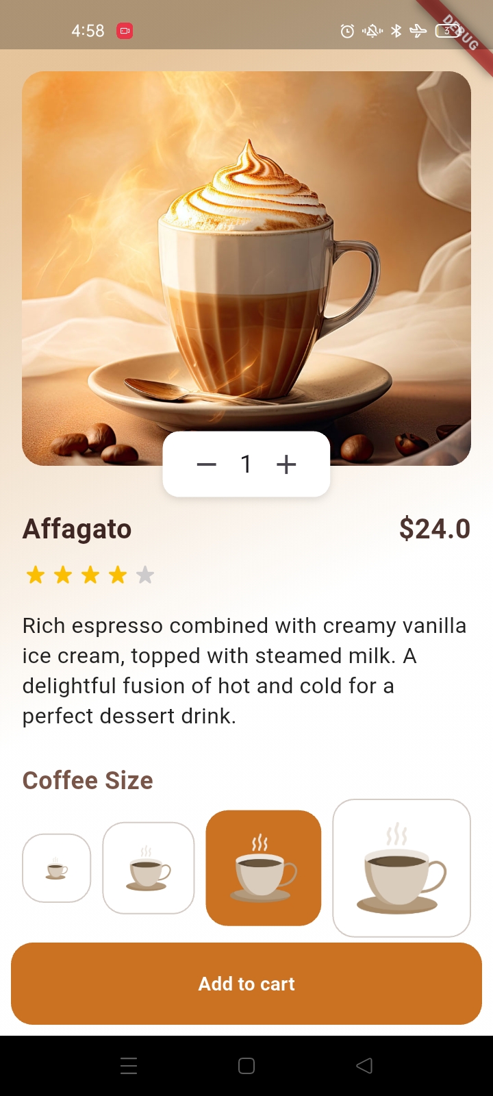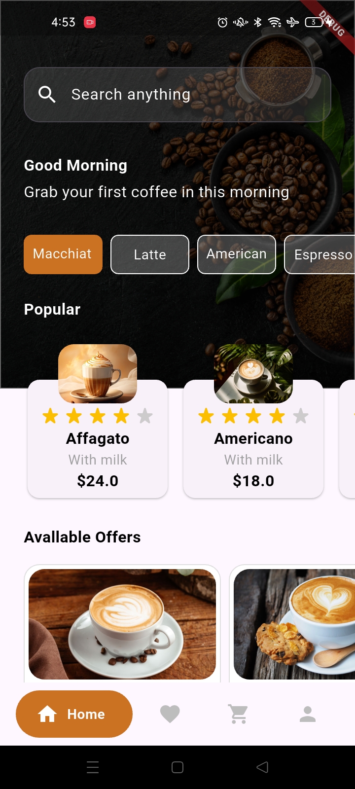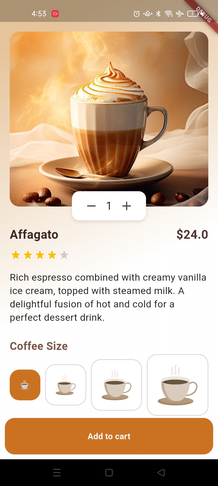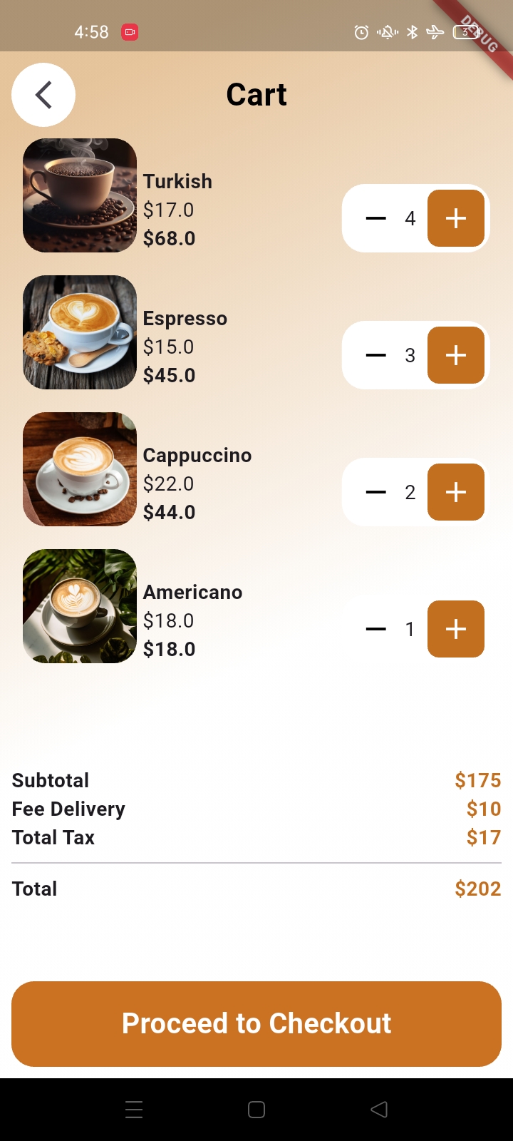 كوفي هاب هو تطبيق موبايل مصمم بشكل جميل لعشاق القهوة لاكتشاف وطلب أنواع القهوة المميزة. من شاشة الترحيب 'ابدأ الآن' إلى صفحات المنتجات التفصيلية، يمكن للمستخدمين استكشاف أنواع القهوة مثل الماكياتو، اللاتيه، الأمريكية، والإسبريسو. يتميز التطبيق بقوائم القهوة الشائعة مع الأوصاف، الأسعار، اختيار المقاس، وعربة تسوق كاملة مع حسابات الضرائب وتكاليف التوصيل—مثالي للاستمتاع بالقهوة الحرفية في المنزل أو أثناء التنقل.